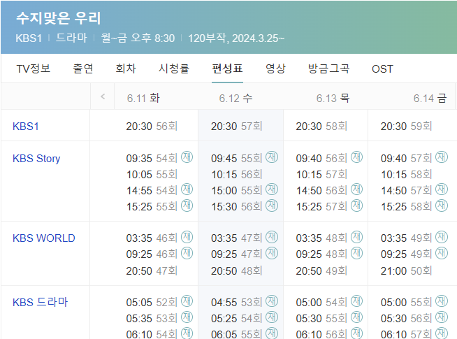 수지 맞은 우리 재방송 일정은 위 사진과 같습니다. kbs 1, kbs story, kbs WORLD, kbs 드라마 채널에서